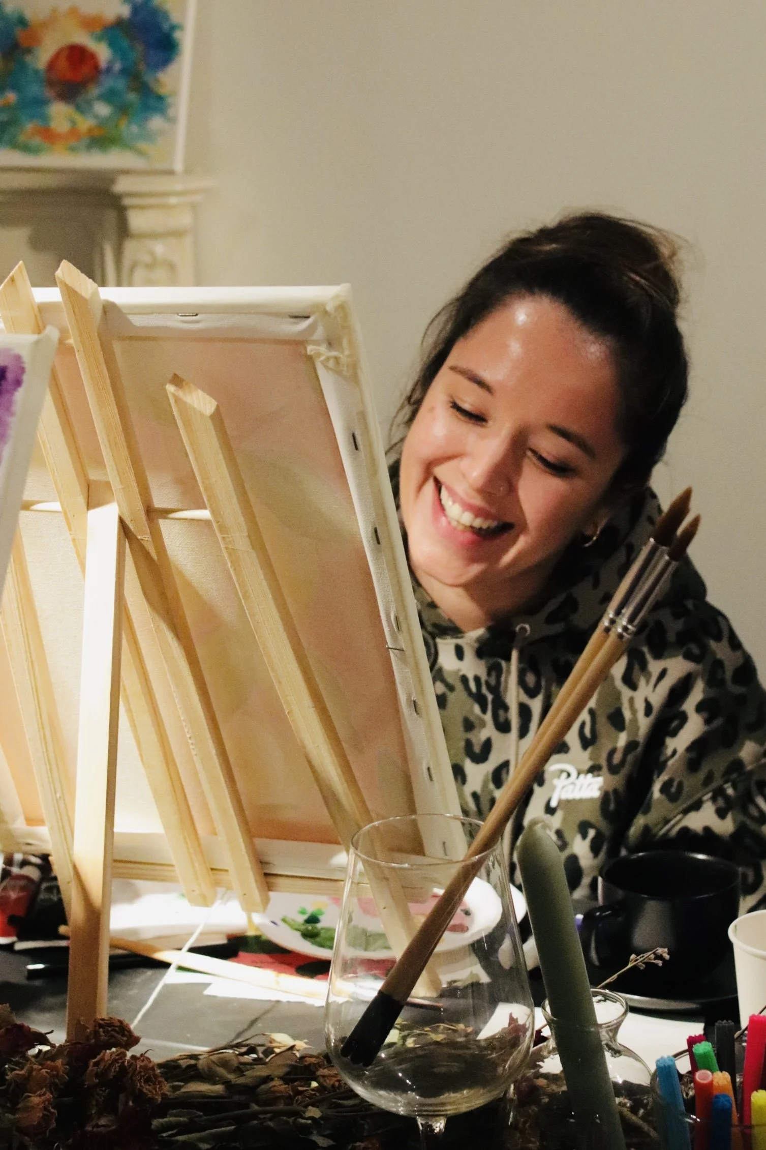 • a full painting kit: a pre-sketched canvas that gently guides your hand, premium acrylic paints, brushes that feel like extensions of your fingertips, palettes for mixing dreams in color, and a cozy apron to keep you anchored in the moment.